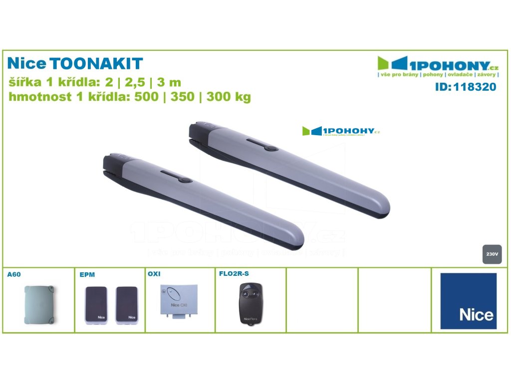 Nice TOONA4005KIT je minisada pohonů pro dvoukřídlé brány do průjezdu 6 m. Tato sada je vhodná pro brány s šířkou jednoho křídla 2/2,5/3 m a hmotností 500/350/300 kg.