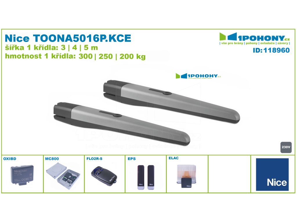 Nice TOONA5016P.KCE plná sada silnějších (3200N) pohonů 2 křídlové brány do 10 m průjezdu na dálkové ovládání. Pro šířku 1 křídla brány 3/4/5 m a hmotnost křídla brány 300/250/200 Kg. Sestava obsahuje 2 pohony Nice TO5016P, řídící jednotku, přijímač, ovladač, fotobuňky a lampu. 230V